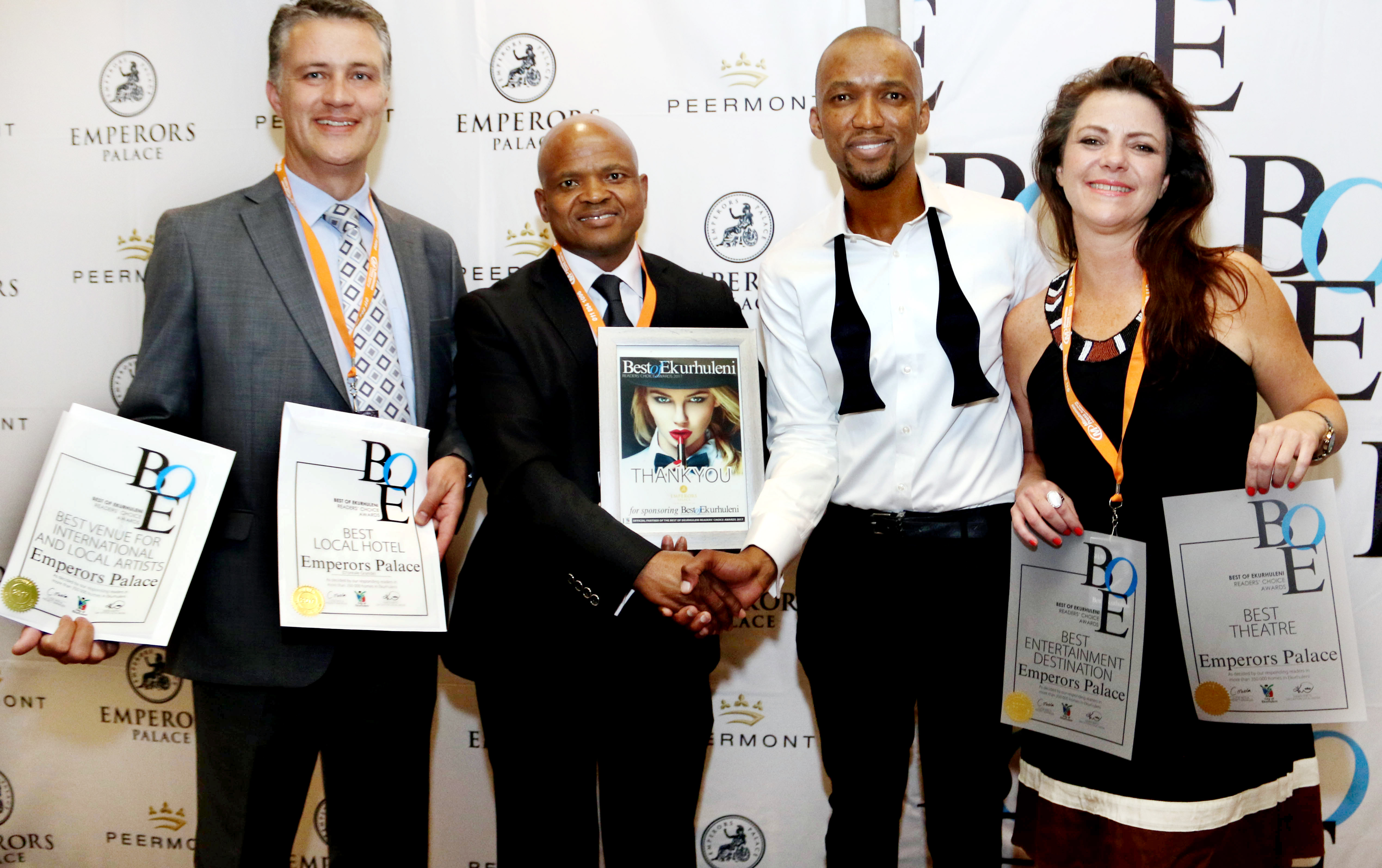 On Thursday evening, October 19 Emperors Palace was once again one of the big winners at this year's Best of Ekurhuleni Readers' Choice Awards, organised for the third year by Caxton Newspapers and held at the Palace of Dreams. The East Rand resort and casino collected seven accolades at the function for "Best Local Hotel (five star D’oreale Grande hotel)", "Best Place to Take Out-of-Towners", "Best Local Theatre", "Best Getaway Place", "Best Casino", "Best Entertainment Destination" and "Best Venue for International and Local Artists Performances". Collecting the numerous awards for the Palace of Dreams were Peermont Entertainment Manager, Andi Shaughnessy, Emperors Palace's General Manager Gaming, Bethuel Ledwaba and Emperors Palace Hotel Operations Manager, Jean Hanekom. Head Project Manager for the Readers' Choice Awards, Clyde Meela of Boksburg also presented certificates of thanks to sponsors of the event including Emperors Palace which was collected by Ledwaba. (Photograph by Yolanda van der Stoep)
