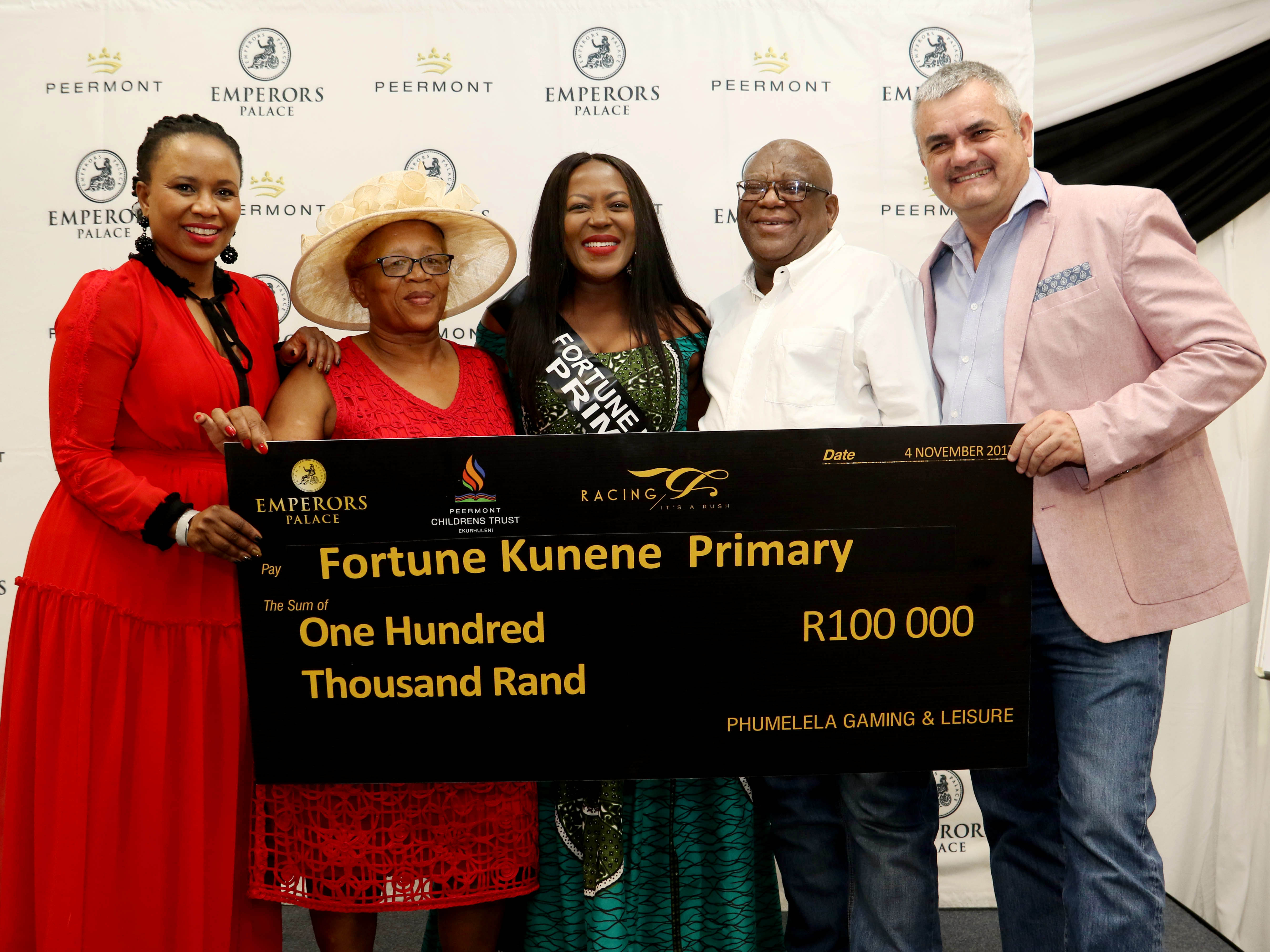 Publically representing Fortune Kunene and the horse was actress, singer and performer, Rami Chuene (middle) of Fourways who is pictured here after the race at the cheque handover ceremony with Peermont Human Resources Executive, Fihliwe Nkomo (left) of Bryanston, Peermont Hospitality Executive, Dave Milne (right) of Benoni and Linda Radebe and Milton Maruping of the school. (Photograph by Yolanda van der Stoep).