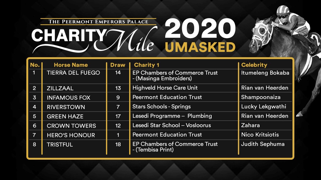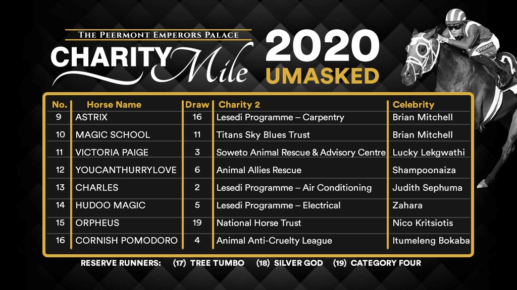 On 27 October the routine Barrier draw took place at the TellyTrack studios in Sandton where a random draw determines which horse represents which charity. This year, because of social distancing, there are 8 celebrities who each represent 2 charities. This is the results for the race on 31 October are as follows with each celebrity, their charities and the horse in the race: