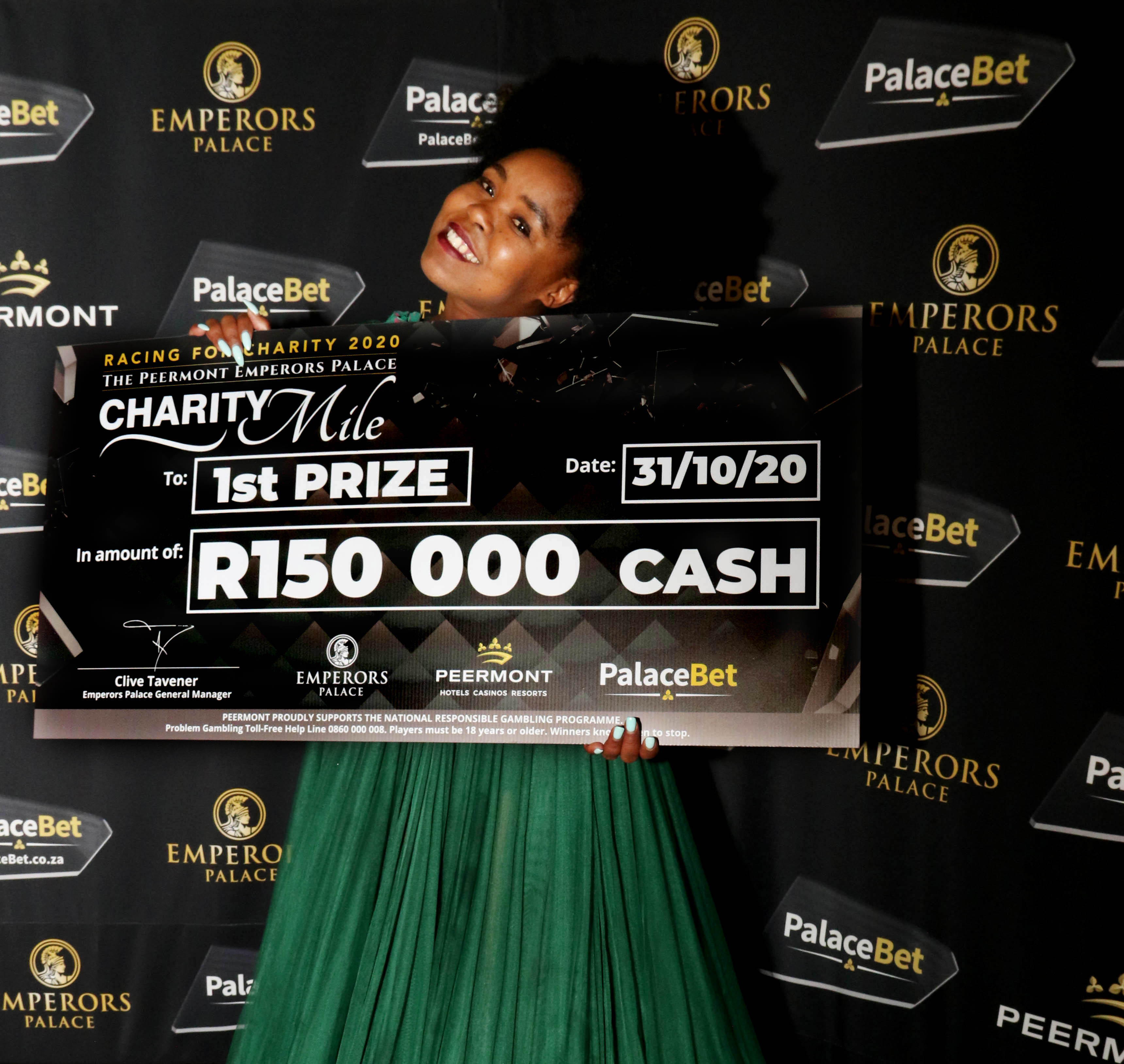 A ecstatic Zahara holds a cheque for R150 000 that she collected for her adopted charity, the Lesedi Programme – Electrical after Hudoo Magic, her affiliated horse for this year’s Peermont Emperors Palace Charity Mile.