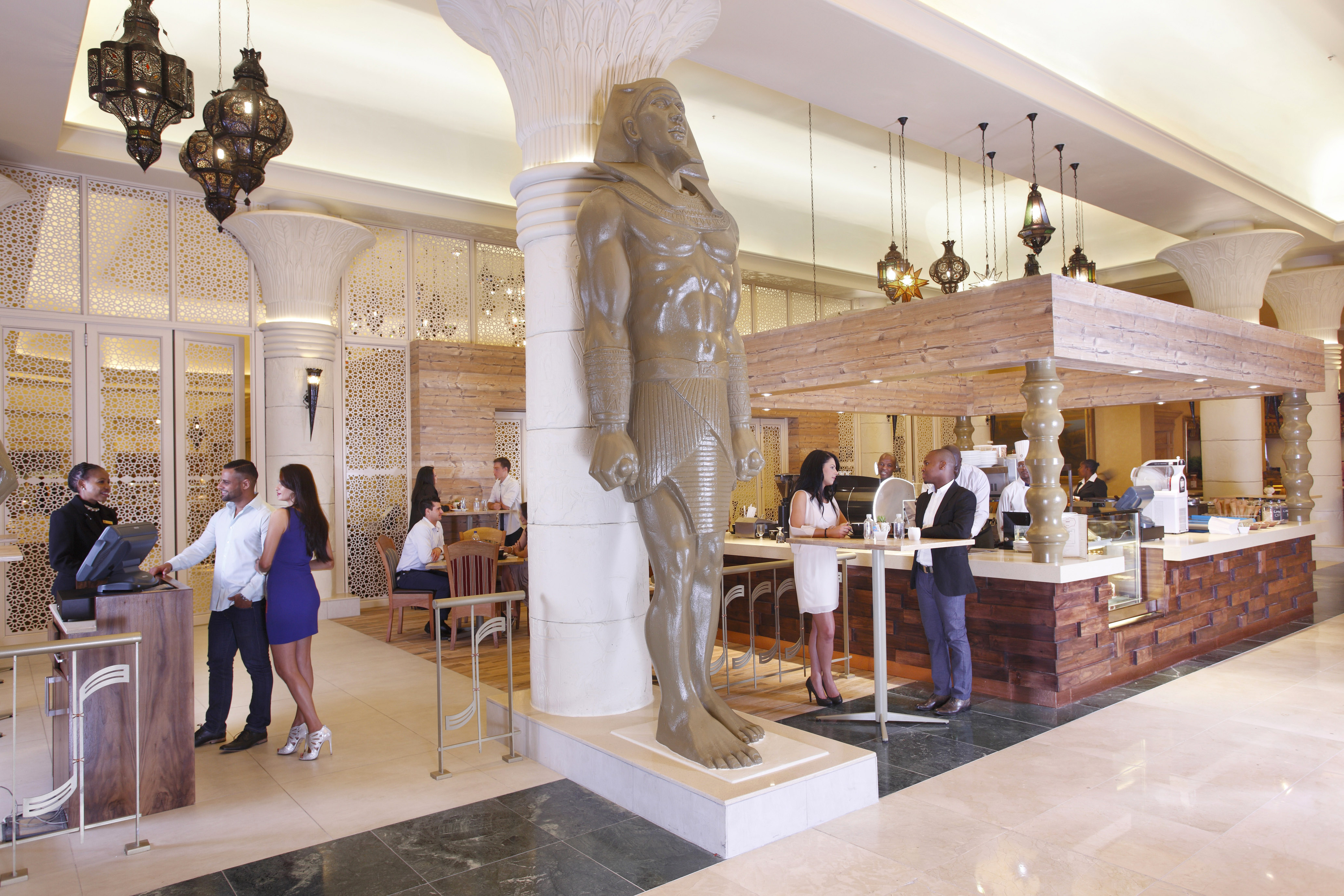 Boasting a fresh interior, an increased 290 seating capacity, clean lined contemporary finishes and a modern feel that stimulates and awakens the senses, the restaurant is subdivided into three different spaces though the innovative use of sliding stacking Mashrabiya screens (an Arabic term given to a projecting oriel window that is enclosed with carved wood latticework) which allows operational efficiencies . The Egyptian inspired artwork is noticeable on stone walls with hieroglyphic carvings and an eye-catching eclectic mixture of feature Egyptian lanterns. Punches of olive green shades are offset against the monochromatic colour scheme of the high domed ceiling that promotes clean and uncluttered simplicity.