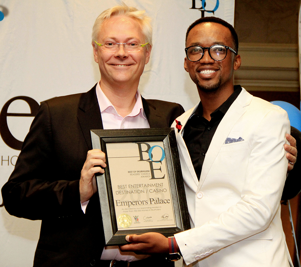 Pictured here receiving this accolade from the Best of Ekurhuleni Readers’ Choice Awards Project Manager, Clyde Meela (right) is Emperors Palace Complex Operations Executive, Nigel Atherton.