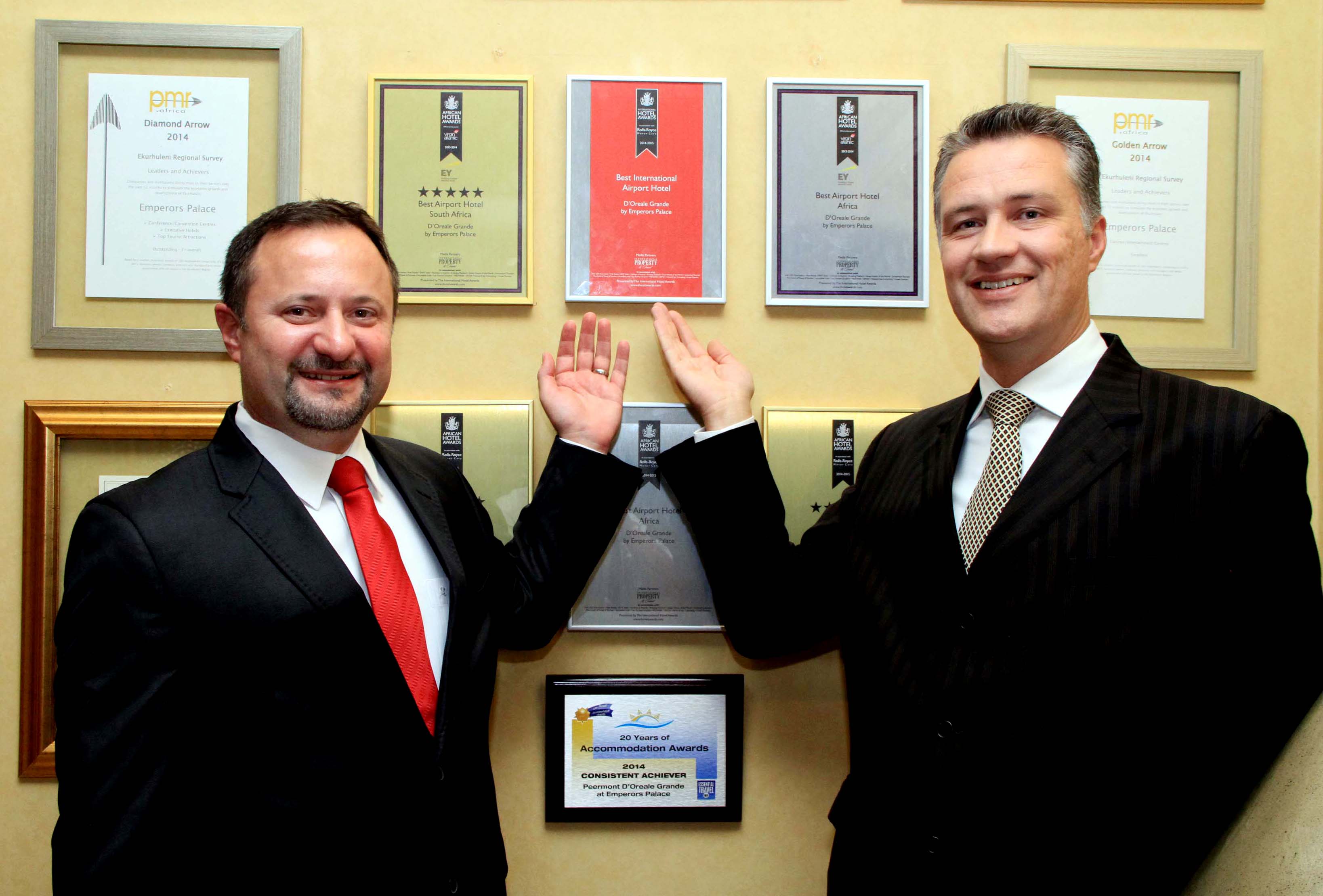 Emperors Palace’s GM: Hotels and Resorts Operations, Wayne Hill and the resort and casino’s Hotel Operations Manager, Jean Hanekom point out the latest accolade won by the Palace of Dreams’ 5-Star D’oreale Grande Hotel - the prestigious Best International Airport Hotel award. The best hotels from 47 countries across the globe competed for one or more of the coveted International Hotel Awards with the winners recently announced at a gala dinner in London. Each entry was subject to extensive scrutiny by the International Hotel Awards’ judging panel, chaired by Sir David Michels, retired Chief Executive of the Hilton Group, who is currently President of both the Tourism Alliance and Institute of Hospitality and it is a huge feather in the Palace of Dreams’ cap to have won one of these awards.