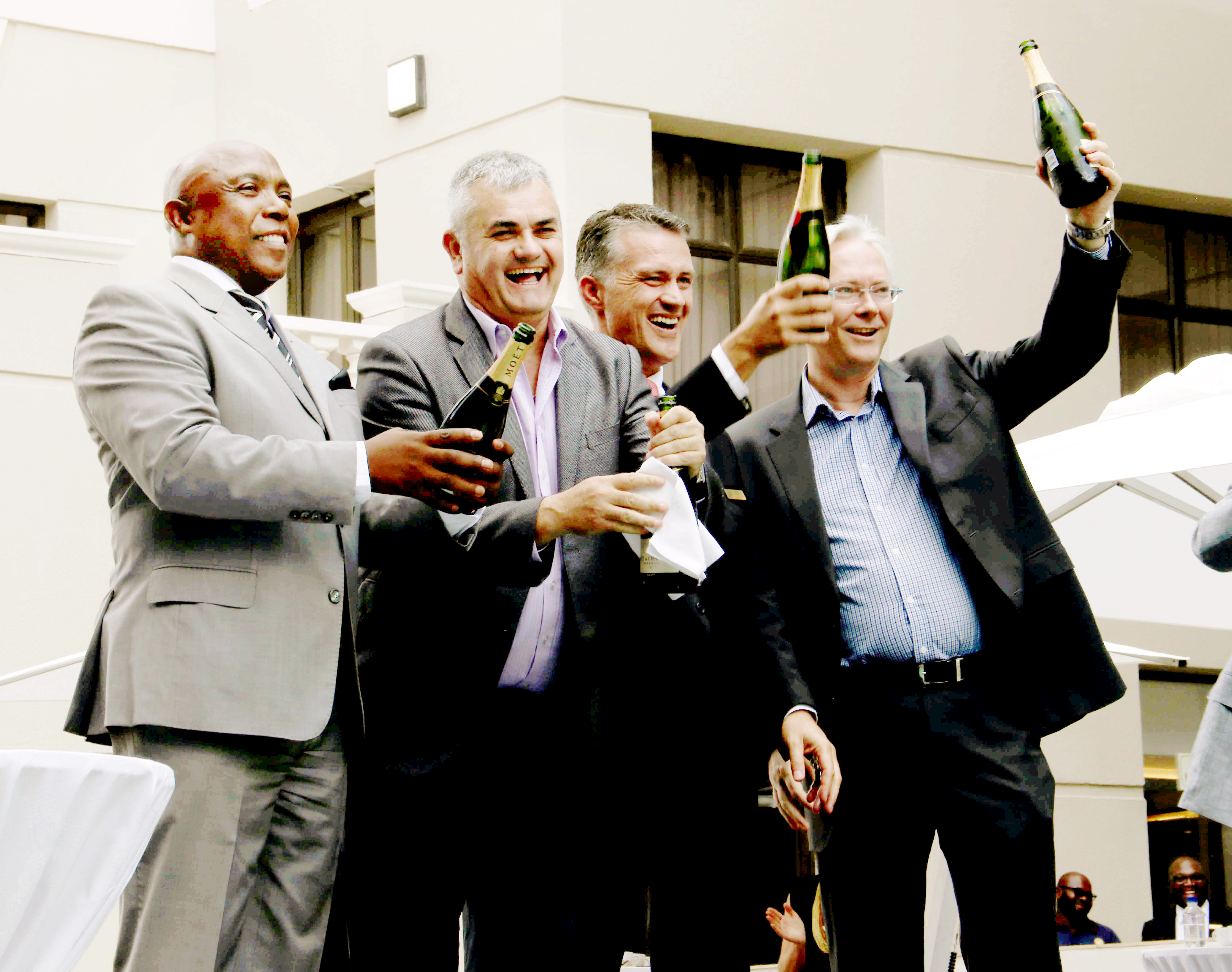 Photo Caption : Cheers … Peermont Development Executive and Deputy CEO, Thabo Mokoena, Peermont Hospitality Executive, Dave Milne, Emperors Palace Hotel Operations Manager, Jean Hanekom and Peermont CEO, Nigel Atherton toast to the completion of the new wing at the 3-star Peermont Metcourt hotel at Emperors Palace on Thursday morning, February 9. Completed at a cost of nearly R113-million the extension has seen a gym, rooftop bar, 93 family sized rooms, 6 Classic King Rooms and one suite added to the hotel, one of four on the Emperors Palace complex.