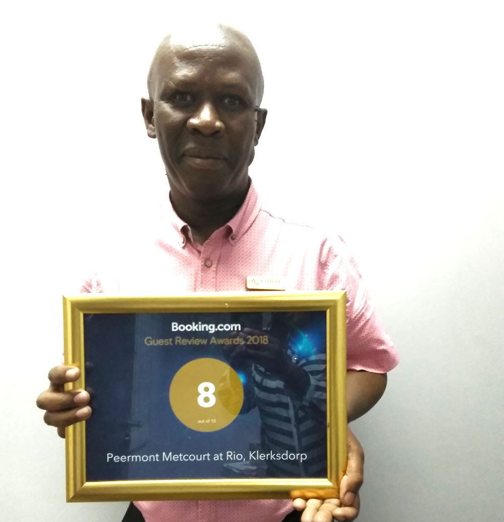 Peermont's Rio Resort in Kleksdorp is proud to announce that it’s Peermont Metcourt hotel received the Guest Review Award 2018 from Bookings.com. The Guest Review Awards program is Booking.com’s annual appreciation program that recognizes partners for their top-notch hospitality according to review scores left by guests after their stay.Pictured with the award is Hotel Manager Mothusiemang Charles Majola.