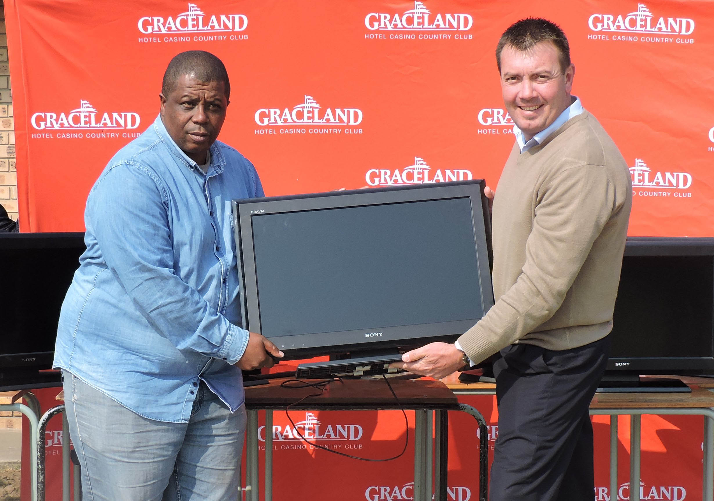 (Above) Mr Willem van Rooyen (Graceland General Manager) handing over TV’s to Mr Nkululeko Ndzekeni (KI Twala SGB Chairman)