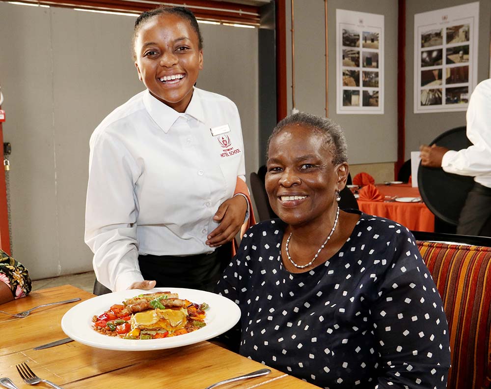 On Friday afternoon, March 1 the Queen Mother of the Royal Bafokeng Nation, Her Highness Mmemogolo Semane Molotlegi was a special guest at the Peermont Hotel School’s (PHS) latest Friday Live Luncheon. The school hosts luncheons on a regular basis to give students who have fully-funded scholarships to the PHS an opportunity to hone their skills in a “live environment”. Here waitron student, Koketso Mmotong of Crystal Park serves the he Queen Mother a meal prepared by the school’s students learning to be chefs. The school is a CSI initiative of the Peermont Community Benefit Trust and is supported by and based at Emperors Palace.