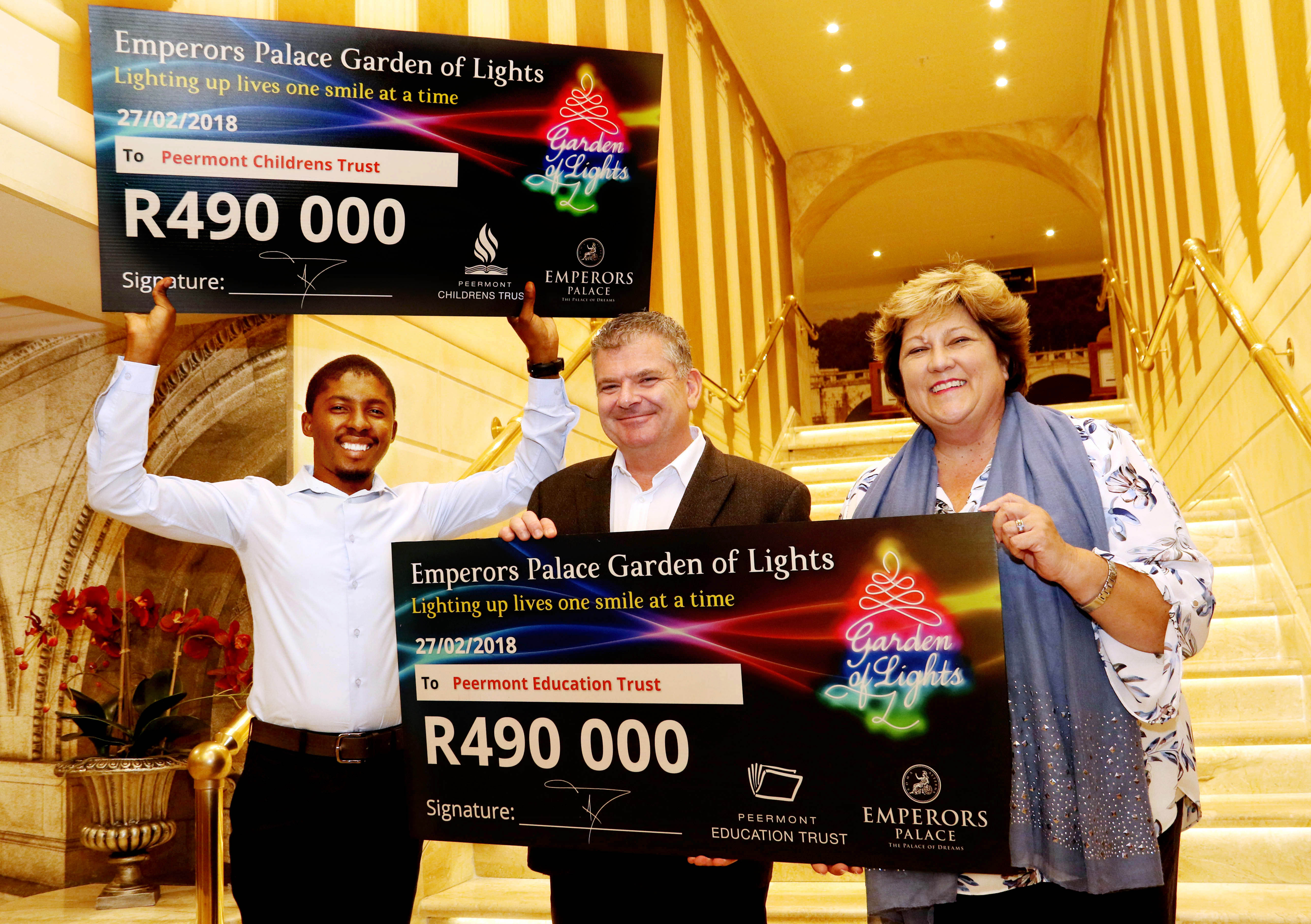 It was a big day for the Peermont Childrens Trust and the Peermont Education Trust on Tuesday, February 27 when Emperors Palace presented these two worthy causes with an amazing donation of R490 000 each. The money, proceeds raised during the Garden of Lights held at the Palace of Dreams during the festive season, was handed to the Peermont Childrens Trust Administrator, Thomas Masango (left) and Peermont Education Trust Manager, Jenny Findlay (right) by Emperors Palace’s General Manager, Clive Tavener (middle) . Nearly R1.5-million was raised with a further R300 00 being given to CANSA and R200 000 to the John Wesley Children’s Home in Kempton Park. (Photograph by Yolanda van der Stoep)